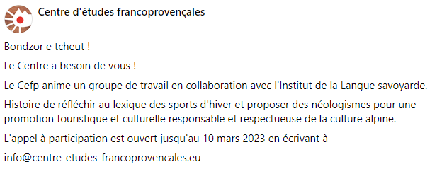 Notre langue étant parlée non seulement en Savoie, mais aussi dans la Vallée d’Aoste, l’Institut de la Langue Savoyarde (ILS) est entré en contact avec le Centre d’études francoprovençales (CEFP) pour travailler sur un glossaire commun depuis les deux côtés des Alpes.