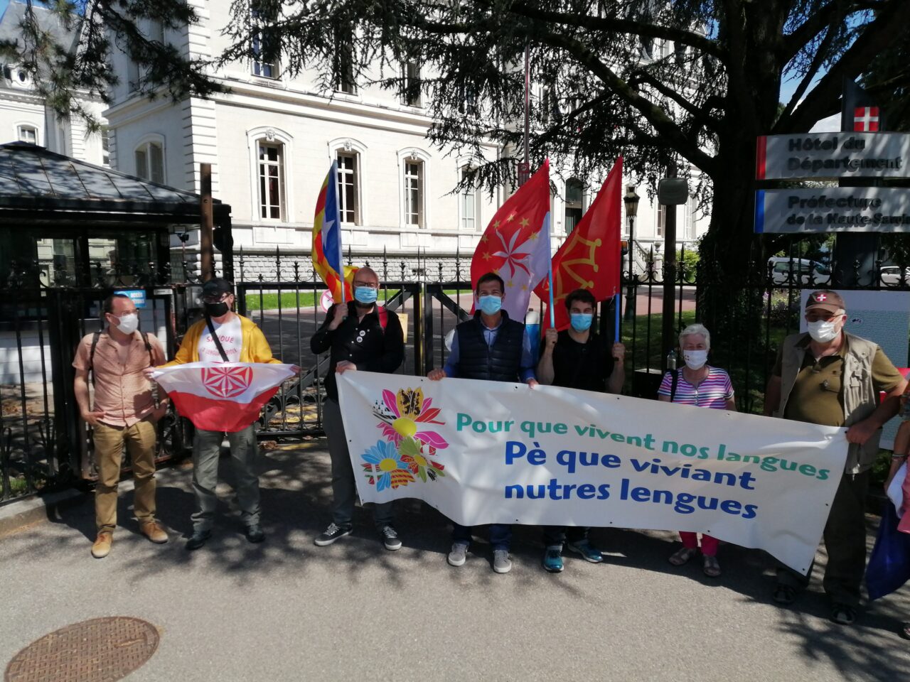 Dans la région savoyarde également, le samedi 29 mai, les représentants des groupes de défense de la langue savoyarde se sont regroupés devant la préfecture à Annecy pour apporter une lettre cosignée par les cinq groupes principaux, à savoir l’Institut de la Langue Savoyarde (ILS), l’Association des Enseignants de Savoyard (AES), Savouè Ecula 2 (Association de parents d’élèves pour l’enseignement bilingue), l’Alliance Culturelle Arpitane (ACA) et Lou Rbiolon (Fédération de groupes de langue savoyarde). Ils ont tous exprimé leur mécontentement à l’égard de la situation linguistique en France.